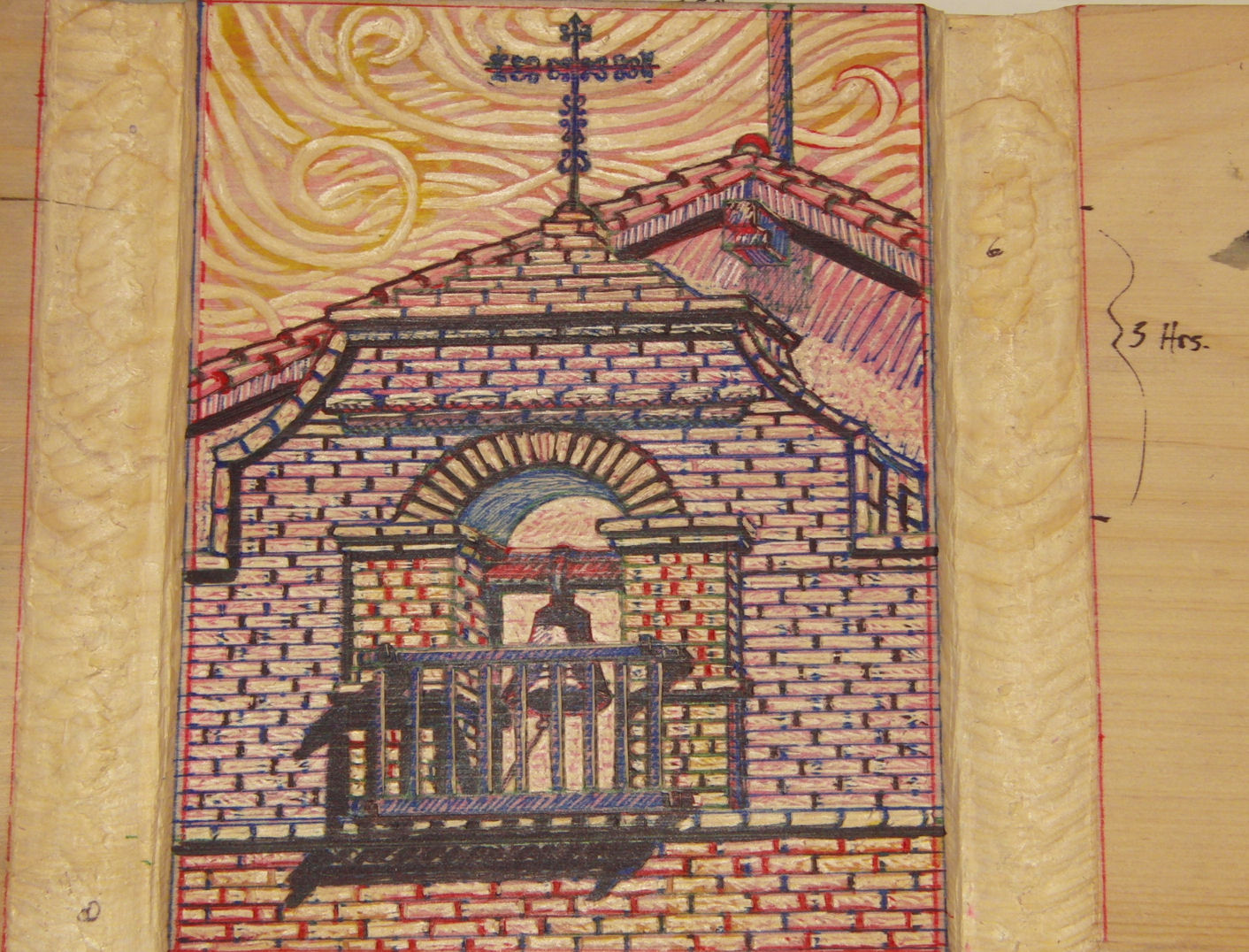 The heart of every relief print is the block. Click on the photo to the right to see a high res image of the San Antonio Bell block in the process of carving. The 3 Hr description shows the portion of the block that it took me 3 hours to carve. All my prints are personally hand pulled in very limited editions. | |